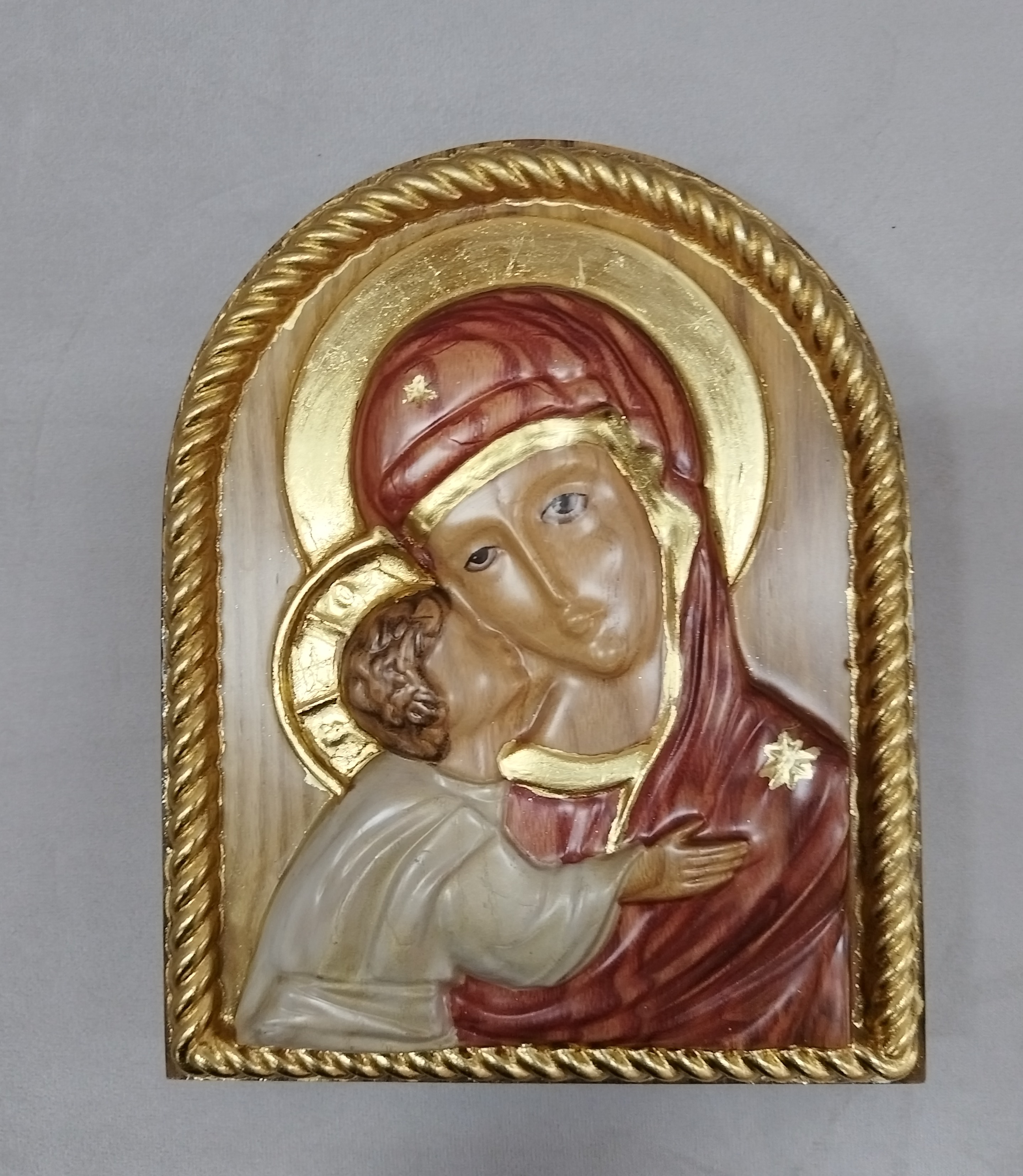 Икона Пресвятой богородицы изготовлена из массива сибирской лиственницы. Для золочения иконы используем поталь (Европа).