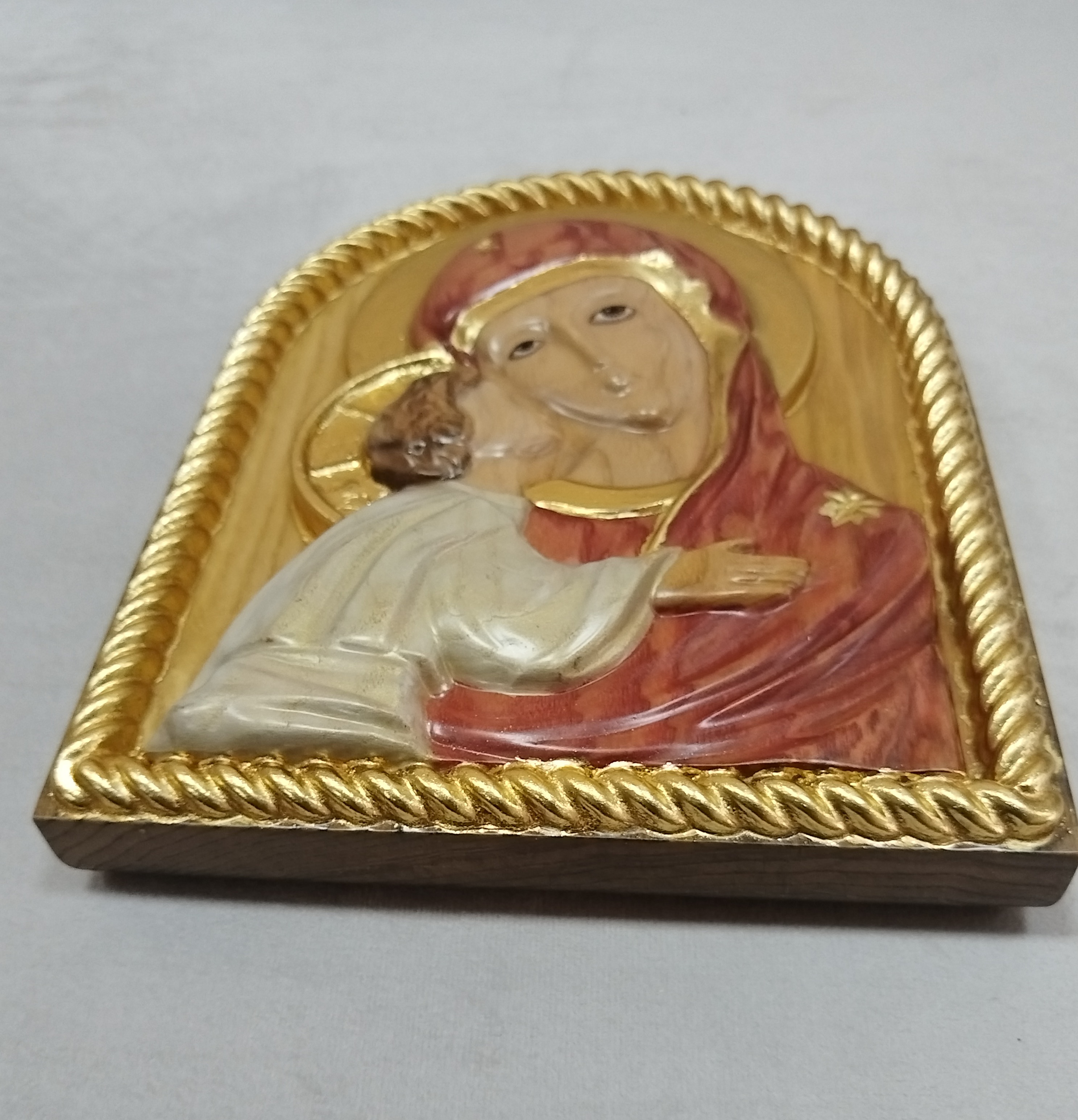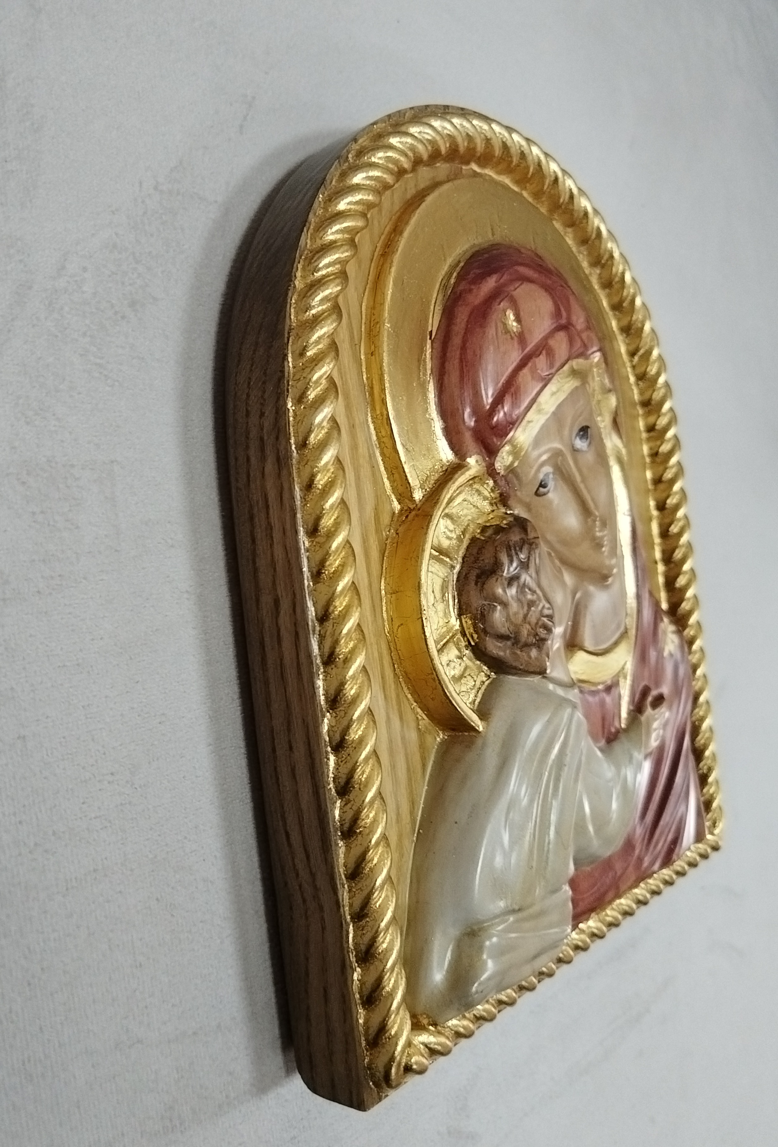 Икона Владимирской Божией Матери изготовлена из массива сибирской лиственницы. Размеры иконы : ширина 180мм, высота 220мм, толщина 40мм.
