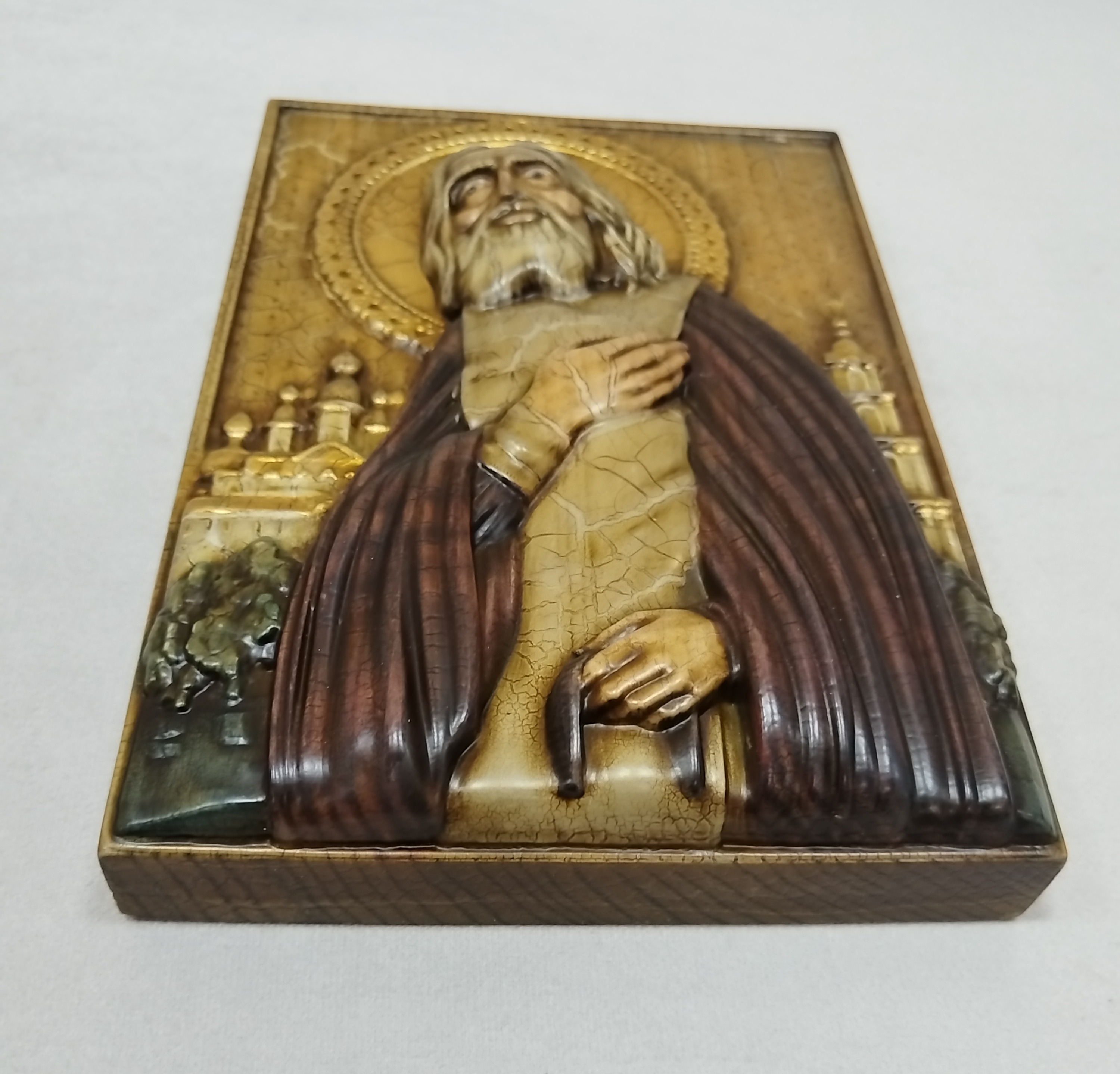 Икона из массива ясеня. Цельноламельный щит. Ручная работа. Эффект старины достигнут применением техники кракле. Икона освящена.