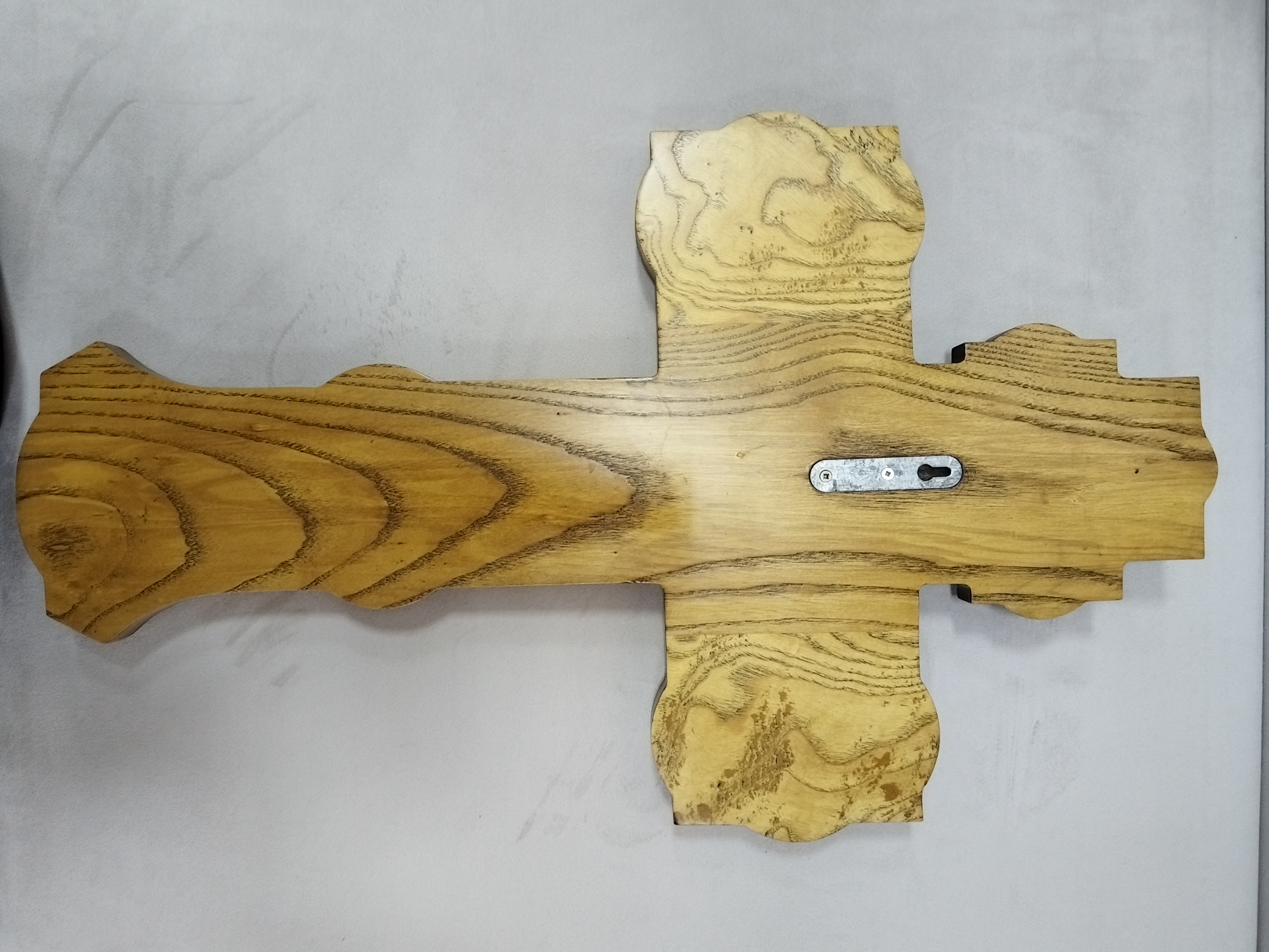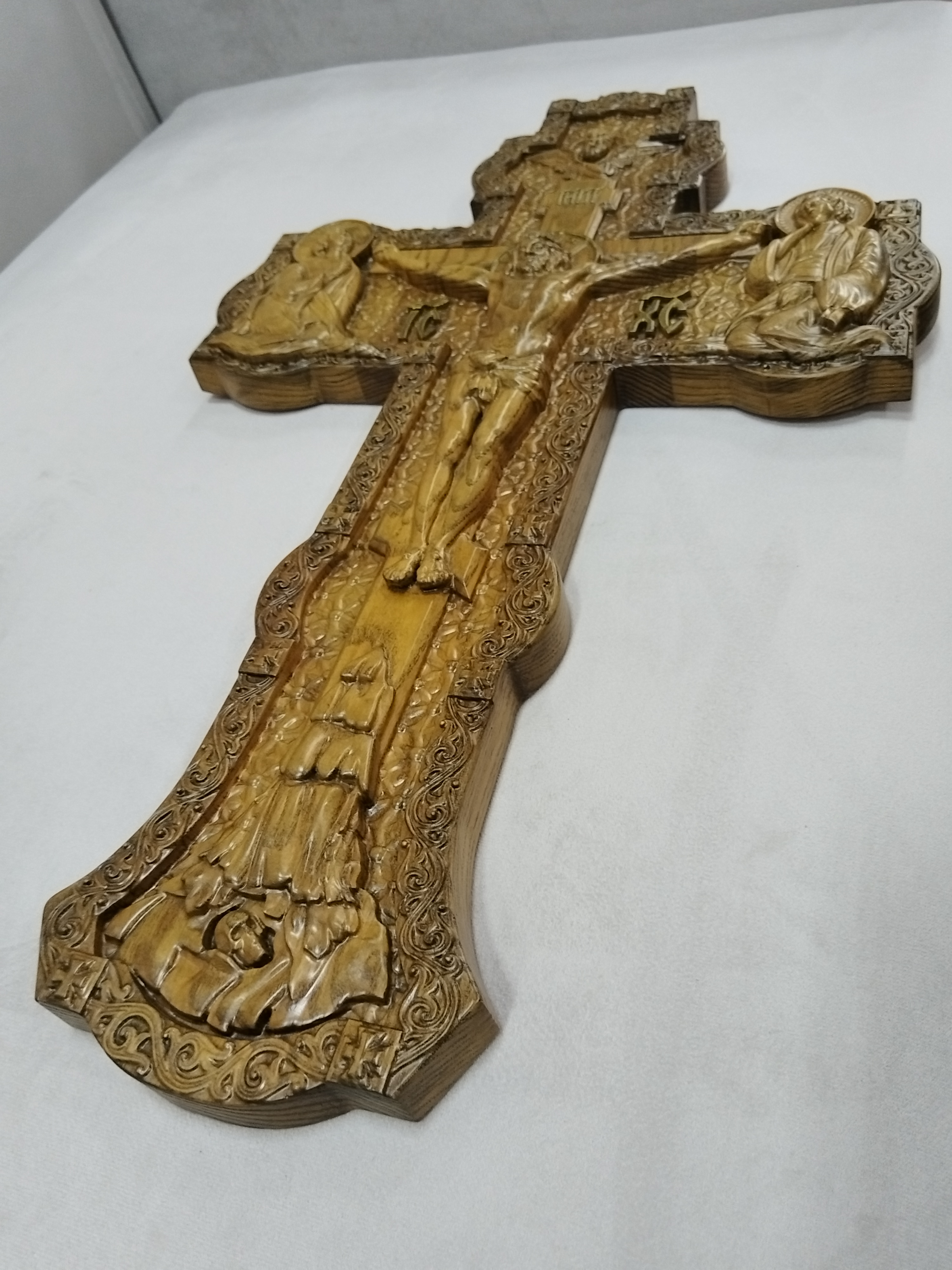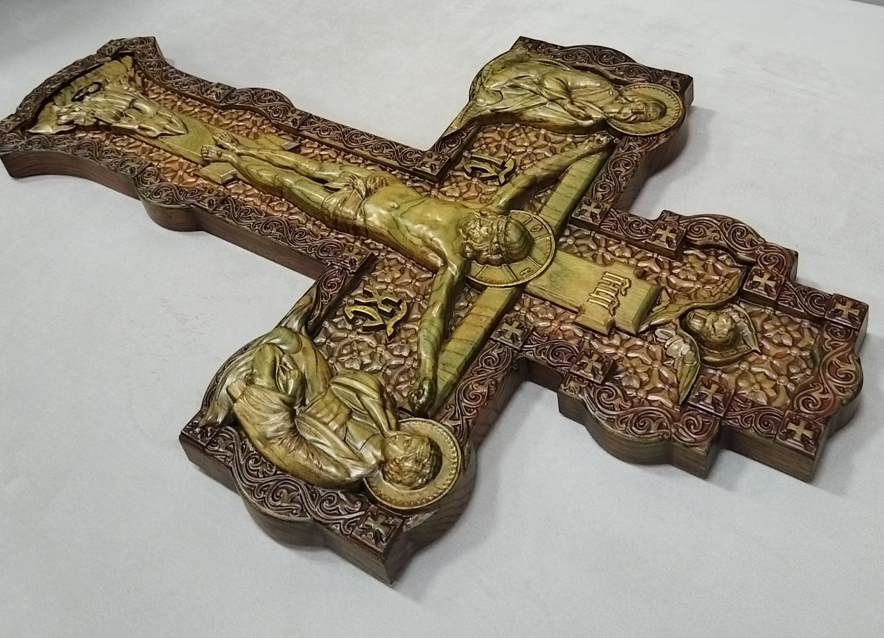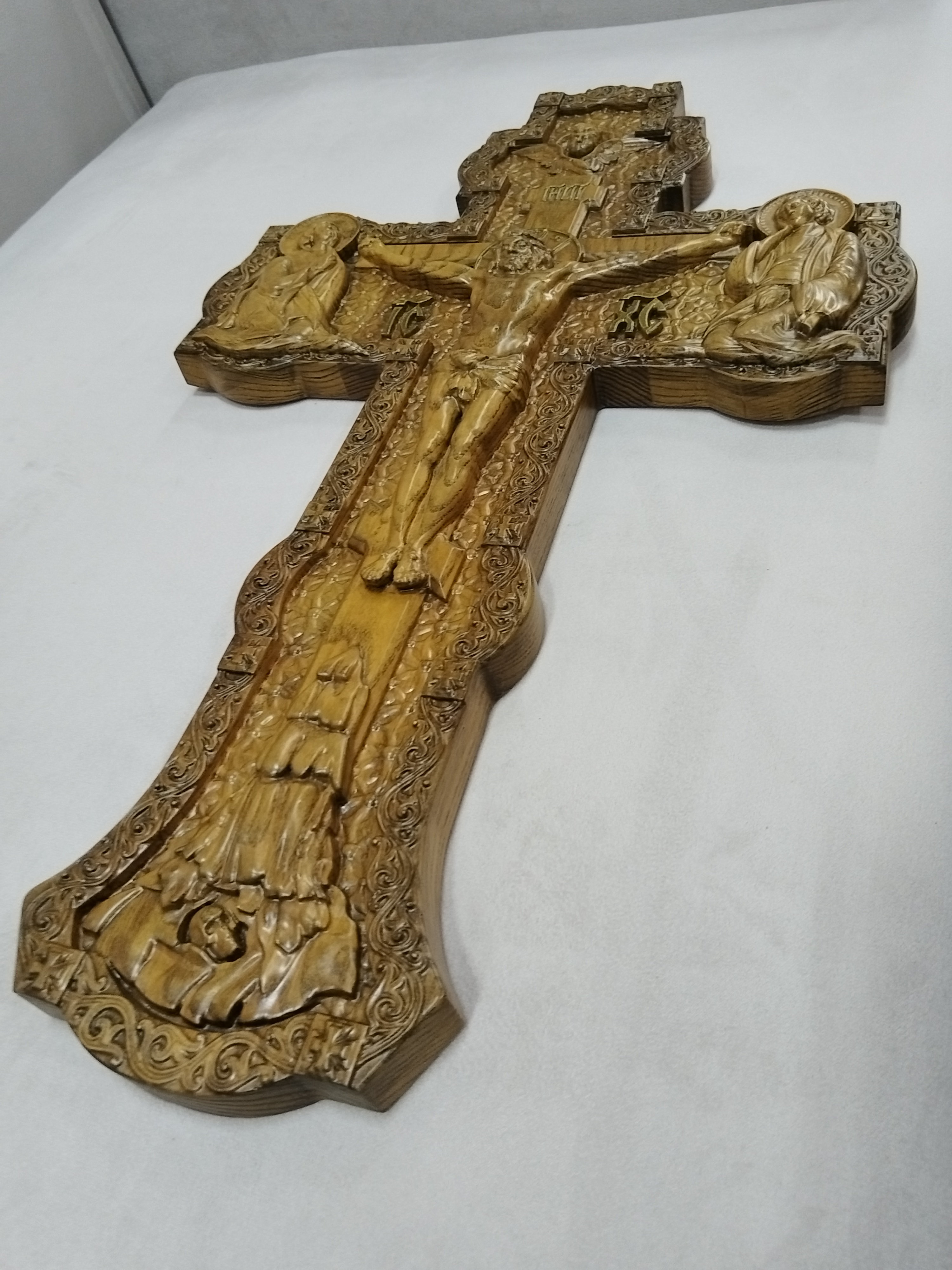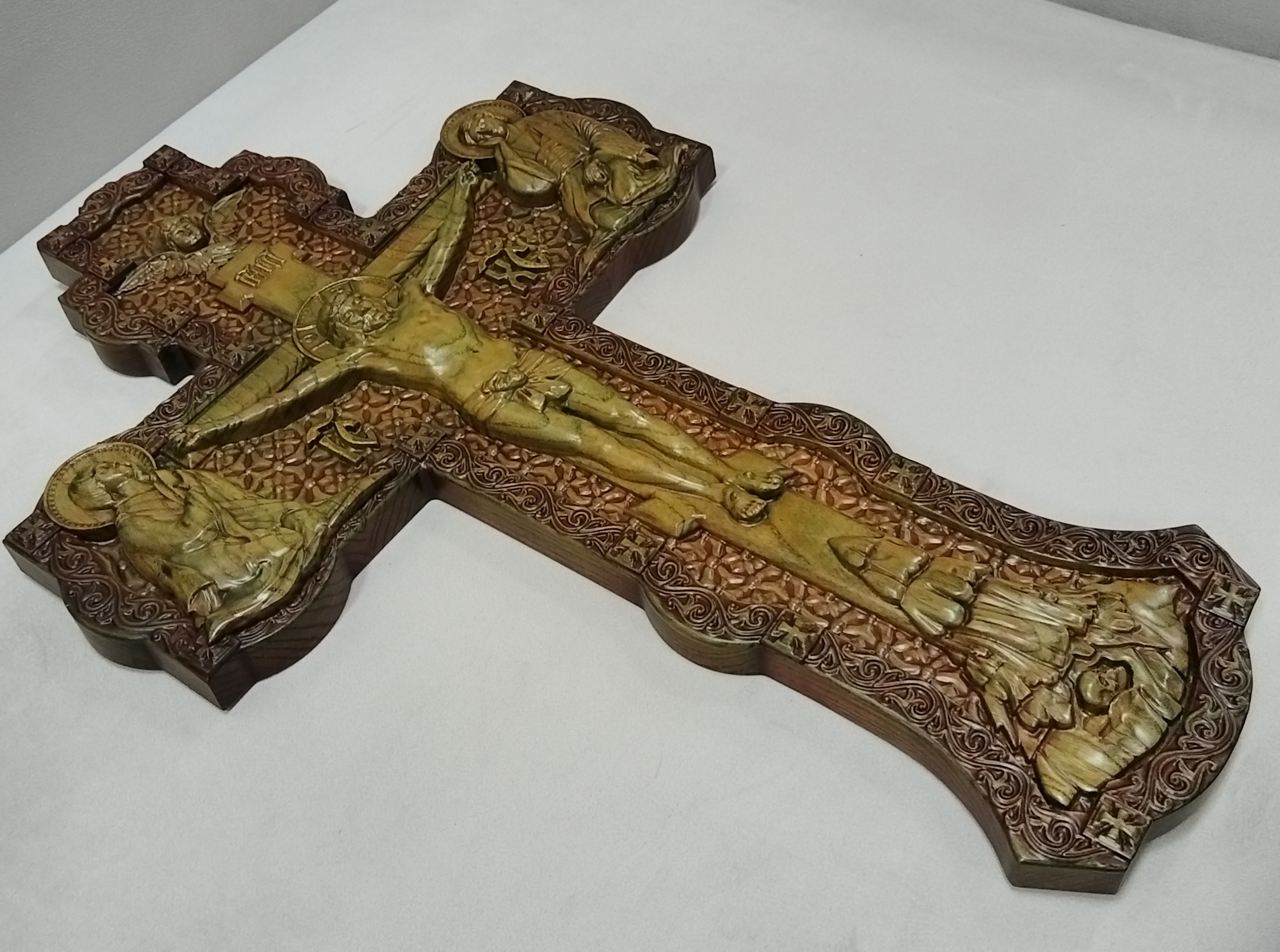 Распятие изготовлено из массива ясеня. Размеры: высота 600мм,, ширина 370мм, толщина 30мм. Ручная работа. Для золочения использована поталь (Европа).